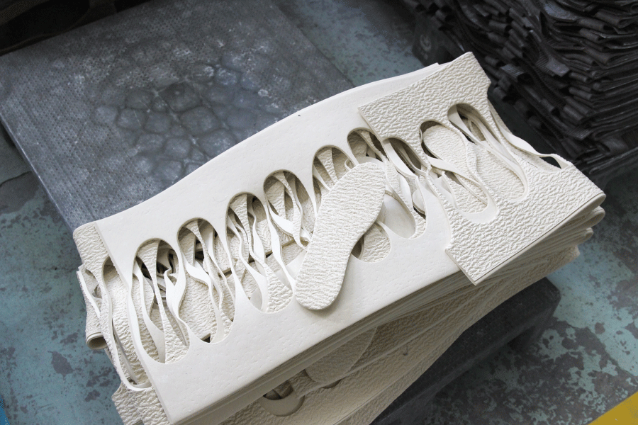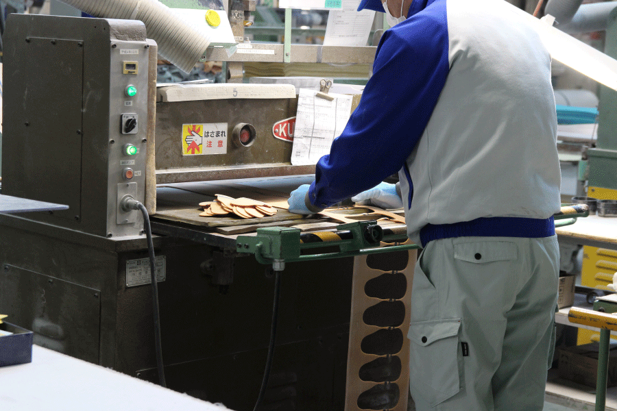 均一な厚みに出来上がったシート状のゴムを機械で裁断して靴底のパーツを作る。