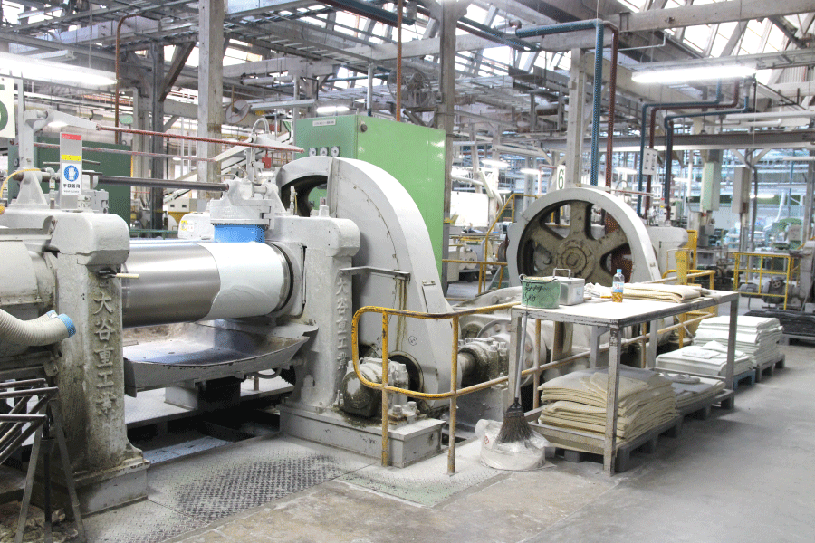 ゴムのかたまりを練って、大きなローラーで熱を加えながらシート状に伸ばしていきます。
