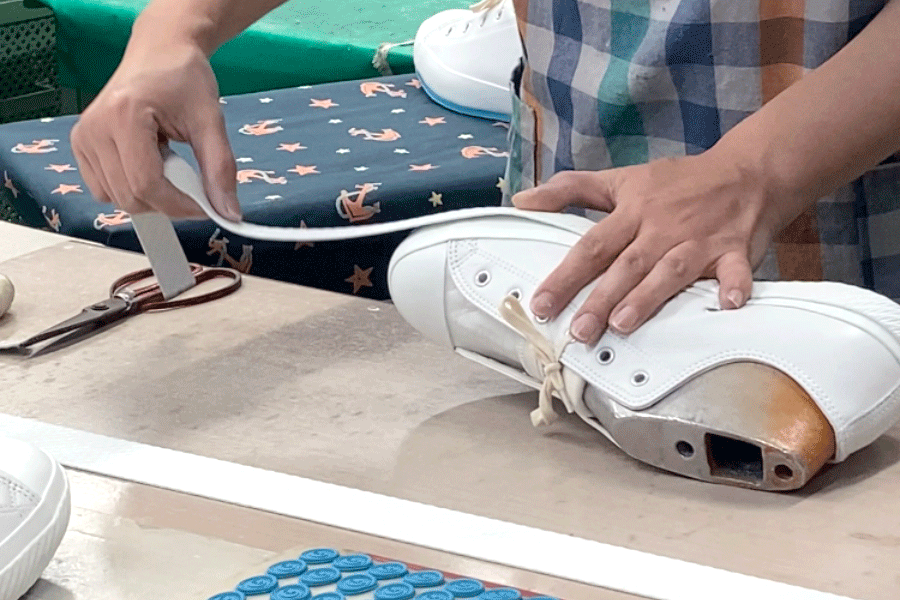 ミシンで縫った生地のパーツと靴底を組み合わせる「吊り込み」という作業。