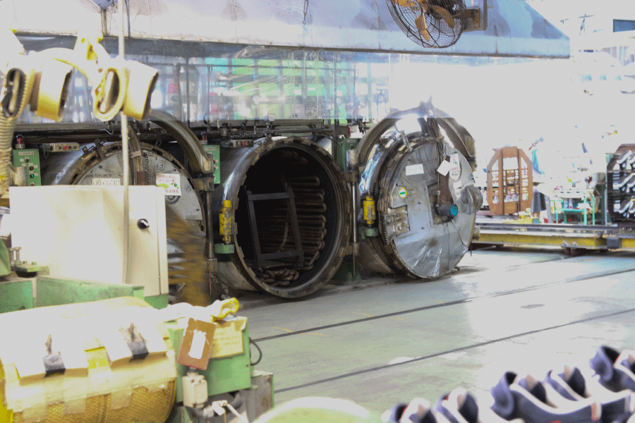 全てのパーツが組み立て終わったら、最後にこの大きな窯の中に入れて「加硫=バルカナイズ」を行い、ゴムを接着させて完成になります。