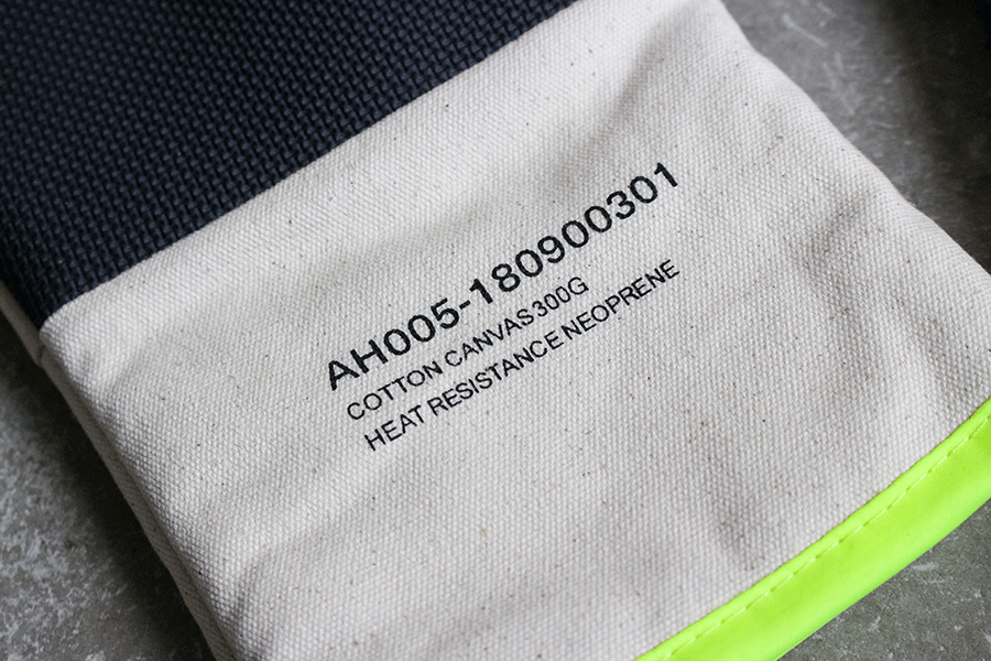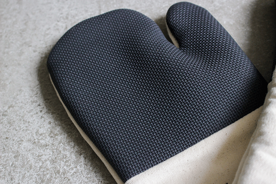キャンバス地をベースにフチ部分にカラーのパイピングを施したオーブングローブ。アメリカの業務用グローブのようなデザインです。自宅はもちろんキャンプでの軍手代わりにも使えそうですね。