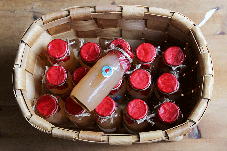 こちらは一足先に届いたリンゴジュースです。8月に収穫された「あかね」という品種のリンゴを丸ごと絞った無添加・無加糖のストレートジュースになります。こちらは店頭で販売をスタートしております。