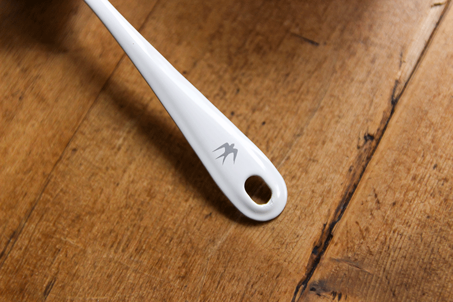こちらは、一つ一つ職人の手作業によって琺瑯を吹き付けて仕上げられています。グレーのツバメマークがワンポイントになっています。琺瑯ならではの、清潔感があるメジャースプーンです。