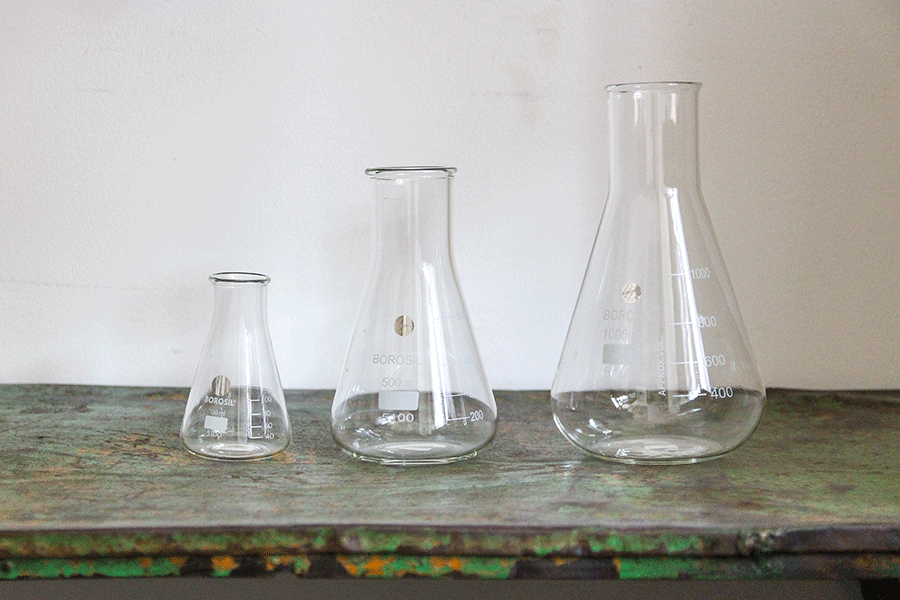 フラスコを生活に取り入れてみると、楽しい。ドレッシングやハーブウォーター、フラワーベースなど使えるシーンは意外と多いです。最近、気に入っているのはカトラリースタンドにする使い方です。