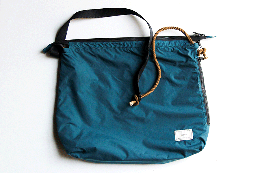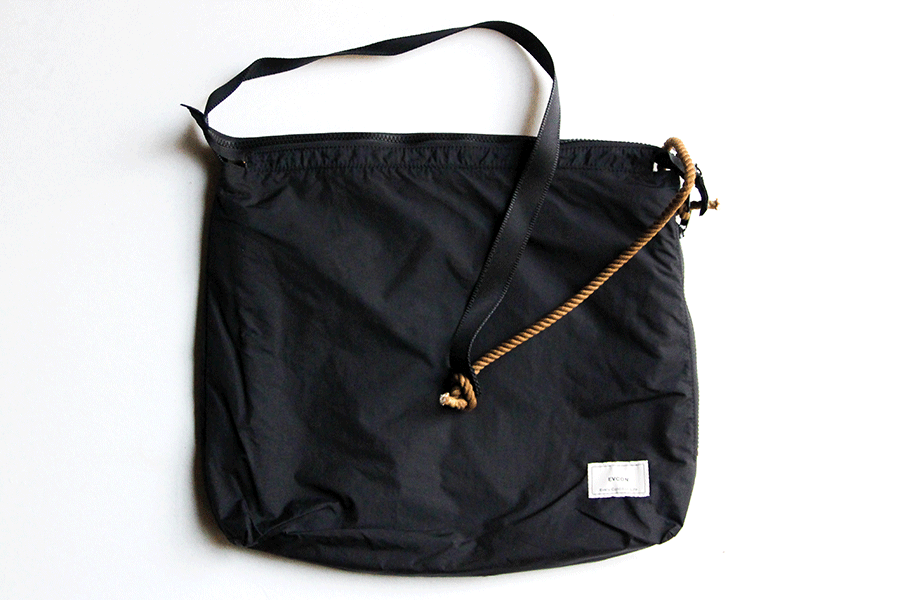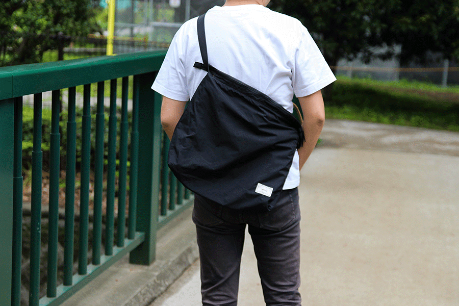 ベルトは、ロープ部分を好みの長さのところで結んで調整できます。A4サイズの書類や、13インチのノートPCなども入ります。