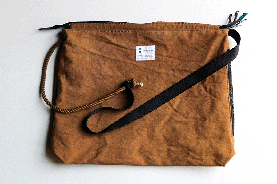 こちらのショルダーバッグは、裏地とベルト部分の紐がコーヒーで染められています。リバーシブル仕様なので、コーヒー染めの面を表にしても使えます。合わせる洋服によって使い分けてもいいですね。