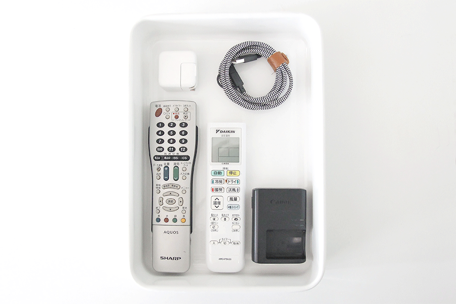 例えば、テレビやエアコンのリモコン、携帯電話の充電器など。使わない時はしまっておきたいそんなモノたちを収納するのに、とても便利です。