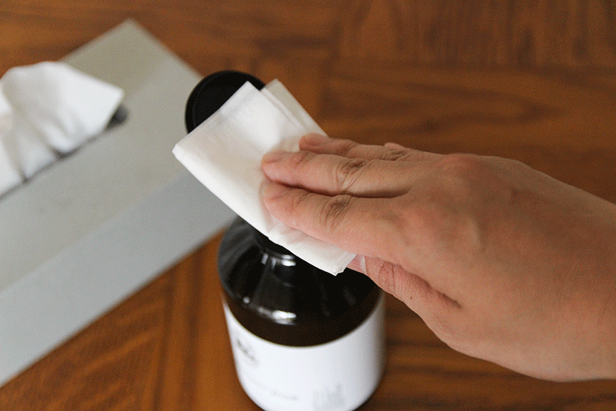 使い方は、キャップを開けてティッシュやキッチンペーパー、フキンをボトルの上に乗せてワンプッシュするだけ。スプレータイプに比べて、無駄に使うことがありません。