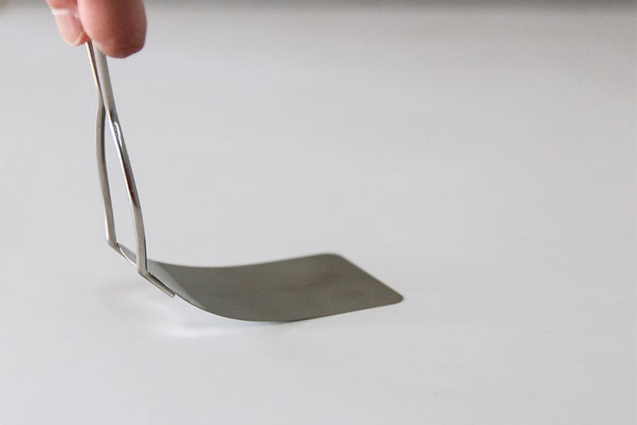 1番の特徴は、すくう部分がペコペコと音がするほど極薄のステンレス板を使用していること。 柔軟性があるので、すくいたいモノの下にスッと入ります。