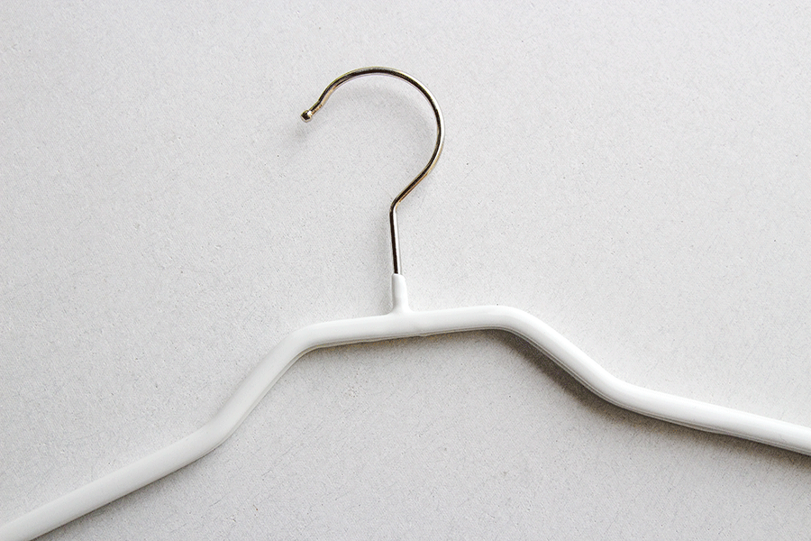 一つ目は、表面にゴムのように見える特殊コーティングを施していること。首回りが広いカットソーや、カーディガンなどハンガーから滑り落ちやすい洋服をかけておくのに便利です。ハンガーによっては、肩の部分とかにハンガーの跡が残っちゃったりしますが、そんな心配もありません。
