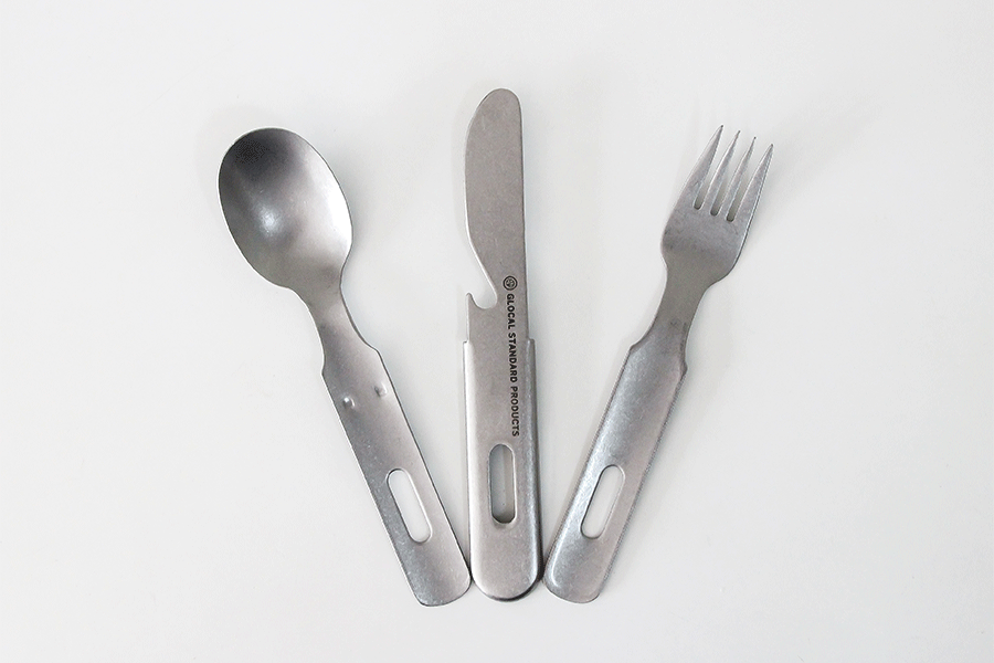 新潟県燕市にて製作された「CAMP 3pcs」。ステンレス製のスプーン、フォーク、ナイフという3つのカトラリーがセットなっています。