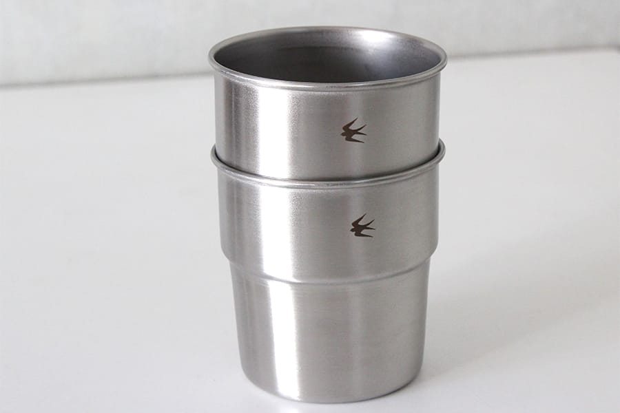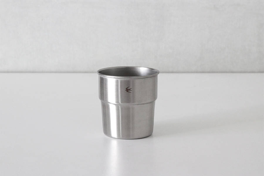 シンプルでステンレスカップですが、くびれたフォルムが持ちやすく、キレイに積み重ねることができます。グローカルスタンダードプロダクツのアイコンでもある「ツバメマーク」も入っています。
