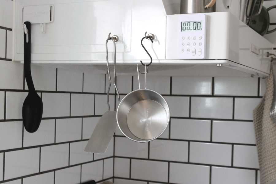 同じサイズ、違うサイズ問わずにピッタリと収まるし、引っ掛けておくこともできるからキッチンで使うのにも向いているような気がします。