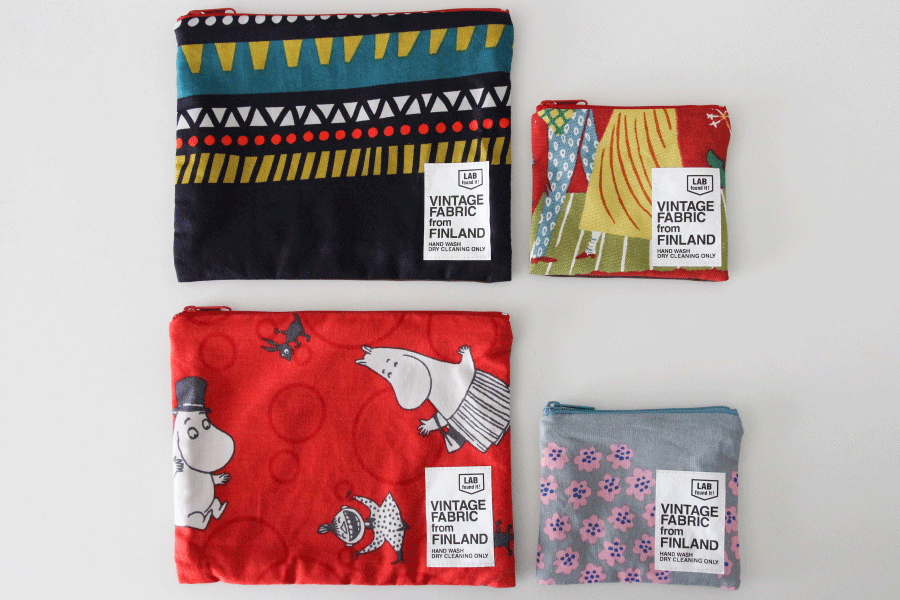 北欧のヴィンテージファブリックと、北欧の古い雑誌や新聞紙などをラミネート加工した生地を使った全て1点物のポーチたちです。