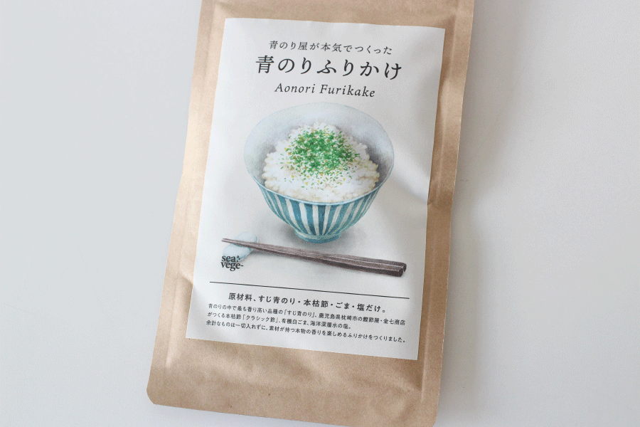 seavegetableさんが作る、青のりの中で最も香り高いといわれる「すじ青のり」と、鹿児島県枕崎市の鰹節屋「金七商店」の鰹節を使った、このふりかけにハマってます。