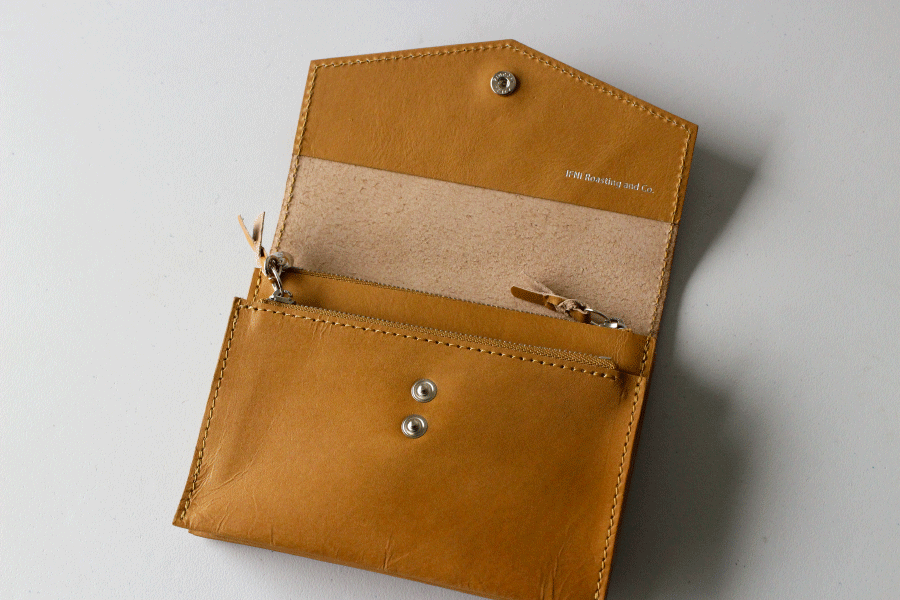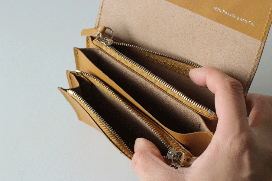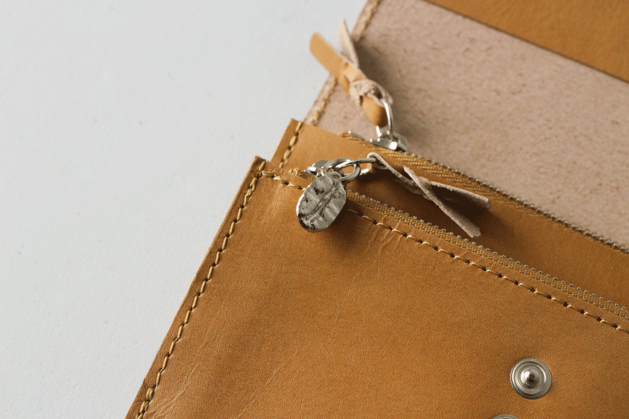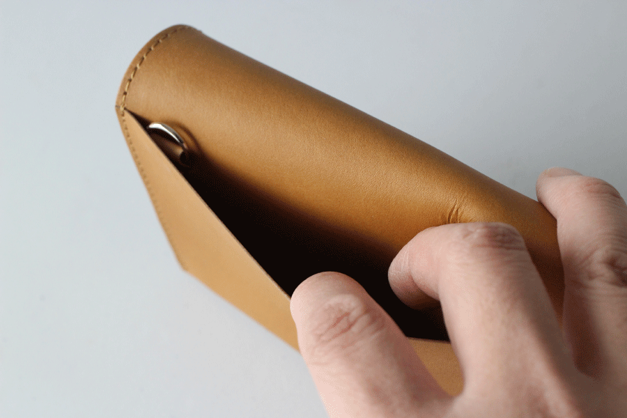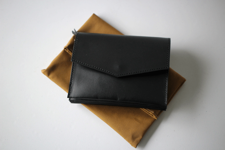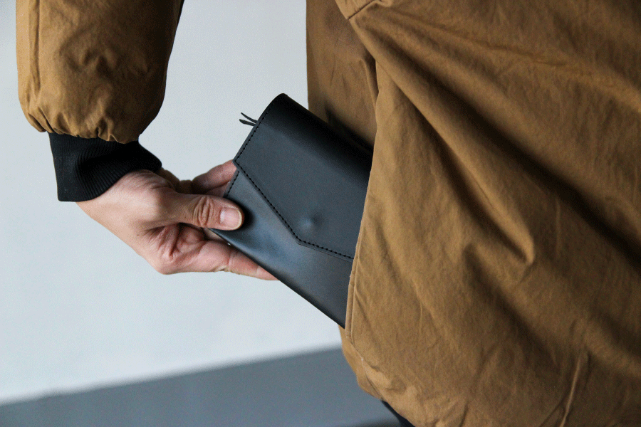 収納力に特化しながらも、ボリュームが出ない制作方法になっているので、デニムパンツのバックポケットにも収まるくらいのサイジングです。