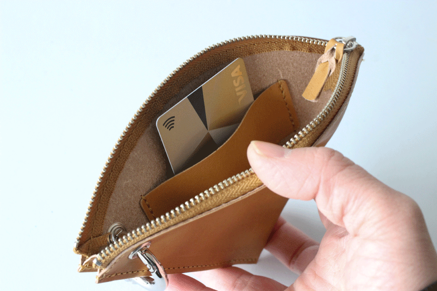 片側マチがある仕様なので、見た目より容量があり、中にはカードホルダーも内蔵しています。