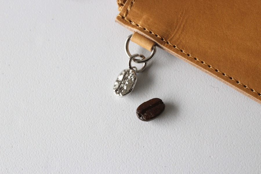 コーヒー豆の形をしたチャームは、本物のコーヒー豆から型取りしたオリジナルパーツが付きます。