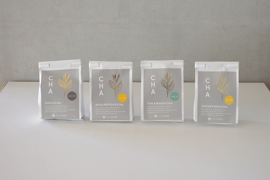 緑茶やほうじ茶の他に、みかんや柚子の香りを合わせたお茶の4種類をご用意しています。贈り物にも喜ばれそうなアイテムですね。